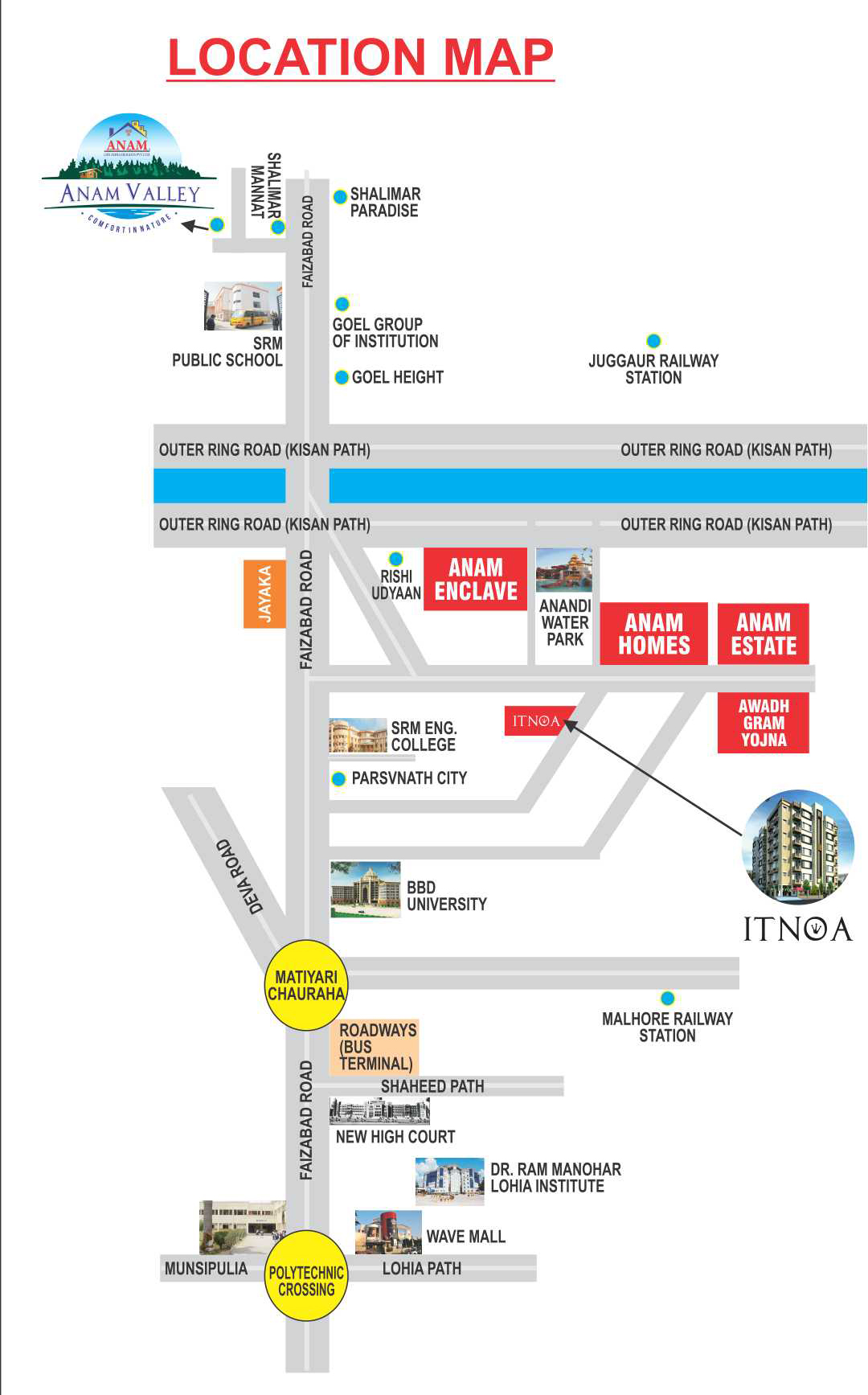 Anam Valley is an intigrated township located at Lucknow-Faizabad road (NH-28), Beside Shalimar Mannat. It is fully institutional and commercial area. This Township spread across 25 Acre in first phase in which development is going on. Life becomes easier and happier here because at some very small distances you get an ease of everything.For your children, there is a good chain of schools and colleges. For family outings, you have amazing restaurants nearby and Business Restaurant.